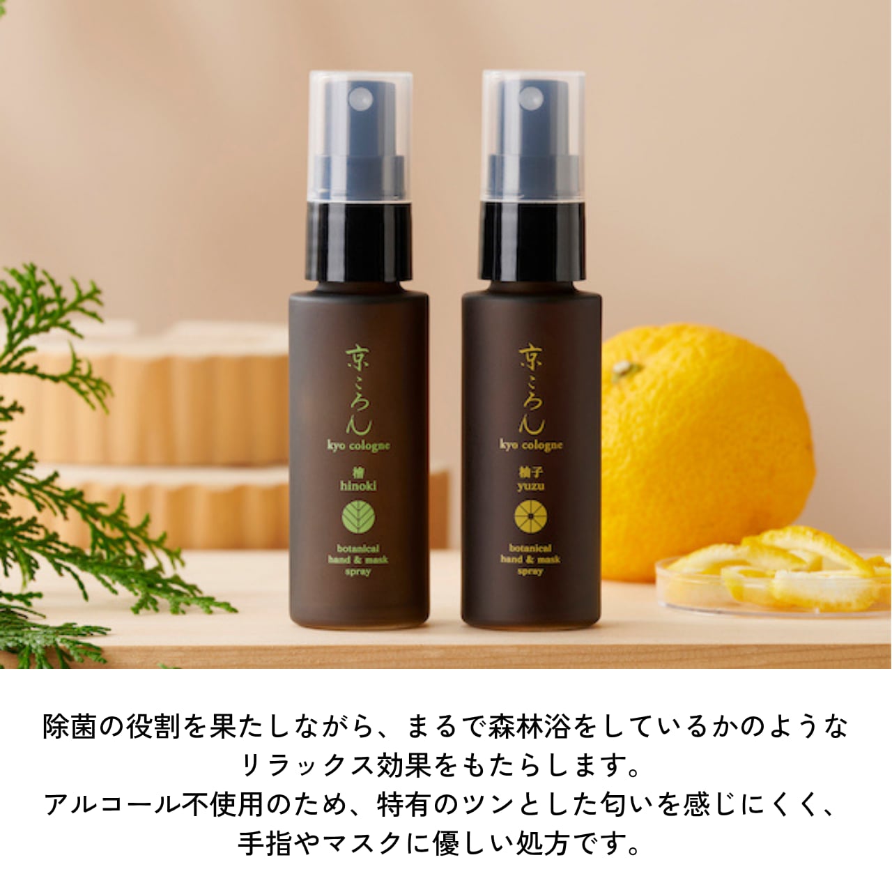 貴重な京都産の和精油と大自然の中で育ったサトウキビの糖蜜から蒸留した発酵アルコールに亜麻仁由来のグリセリンを配合しました。